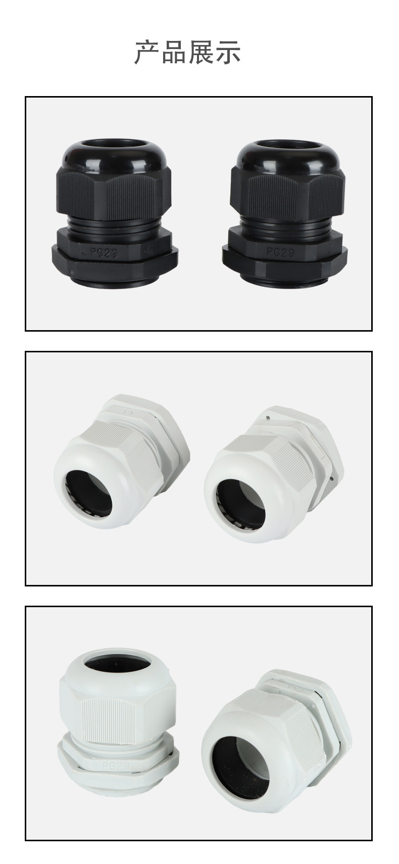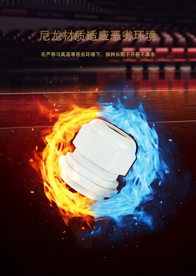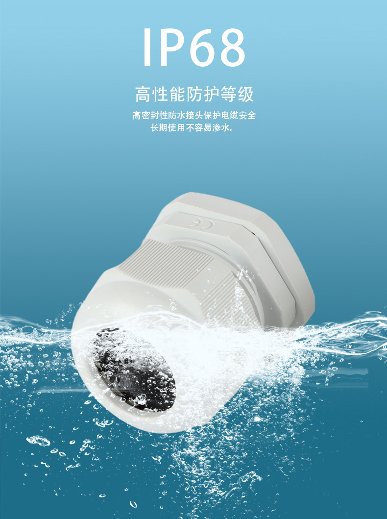 尼龍材質(zhì)適用惡劣環(huán)境紅、灰、黑、深灰、白、藍(lán) 六種顏色常規(guī):黑、灰兩種顏色,其它顏色需要定做在嚴(yán)寒與高溫等惡劣環(huán)境下,保持長(zhǎng)期不開(kāi)裂不漏水高密封性防水接頭保護(hù)電纜安全,長(zhǎng)期使用不容易滲水