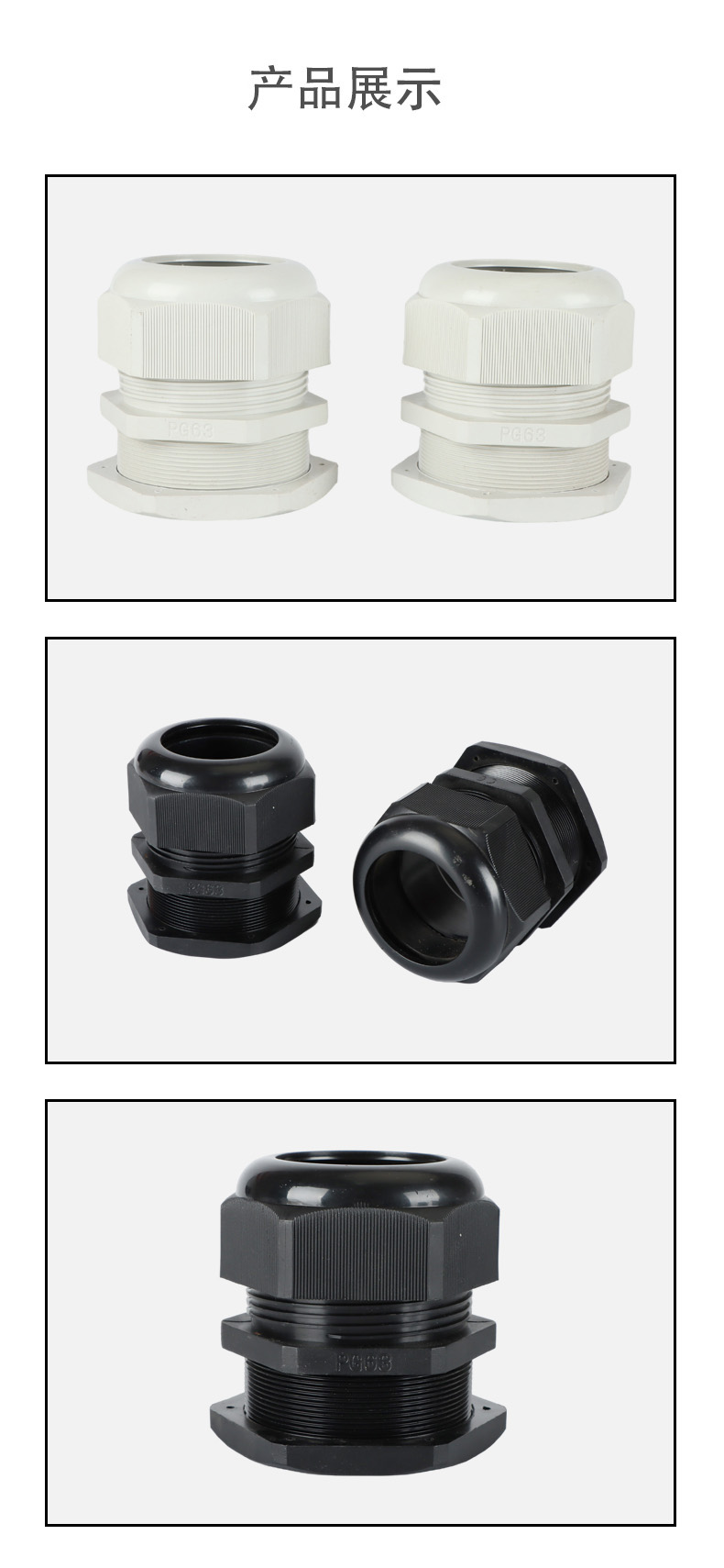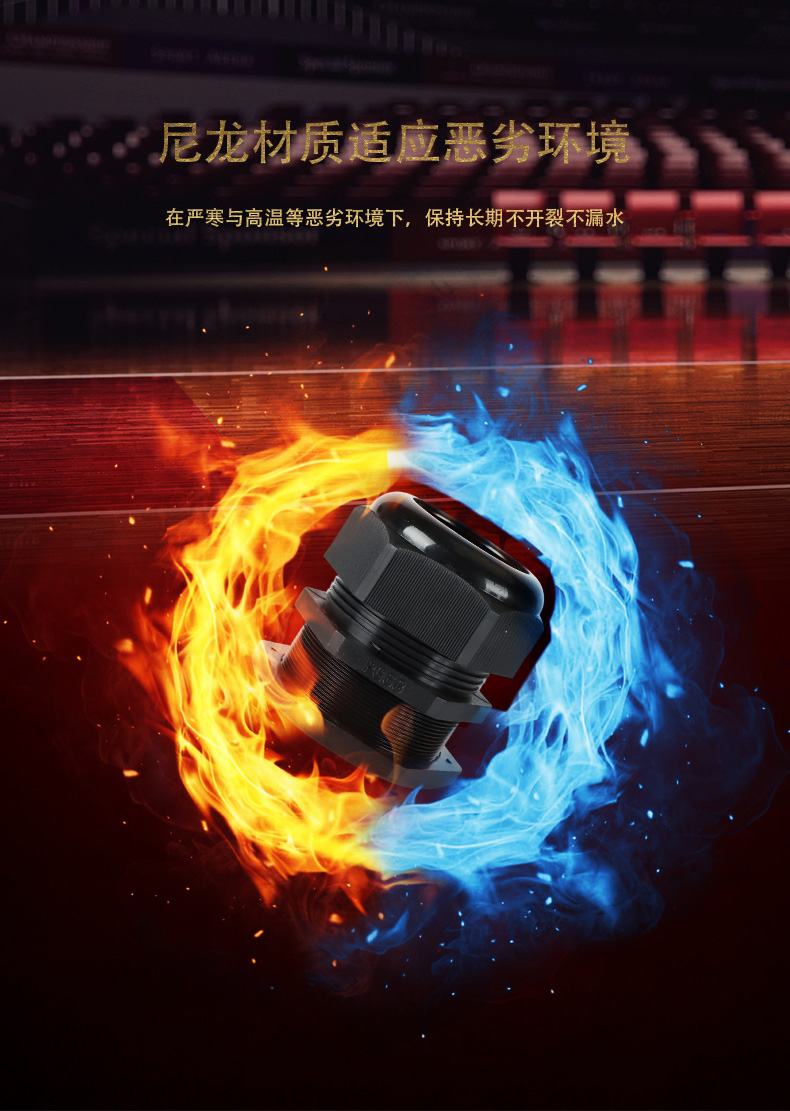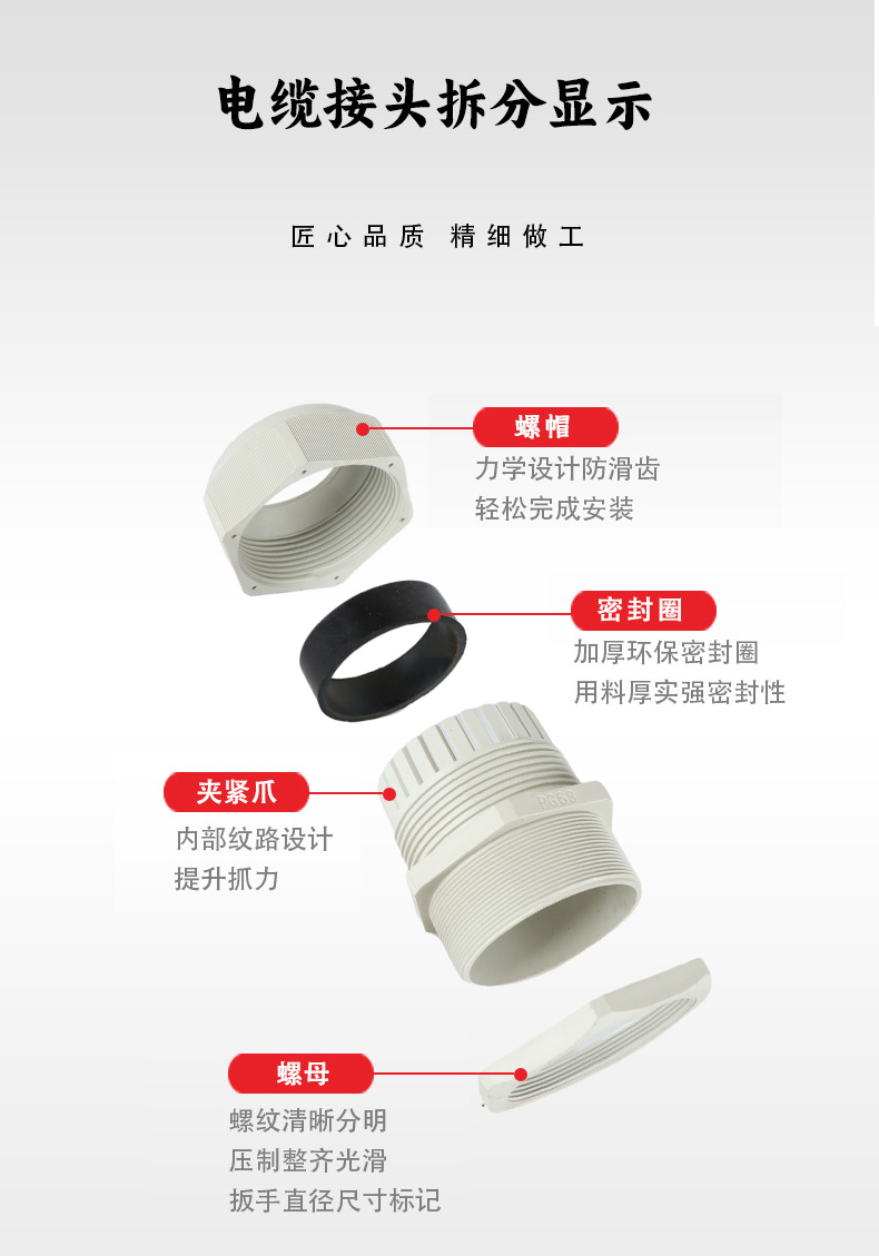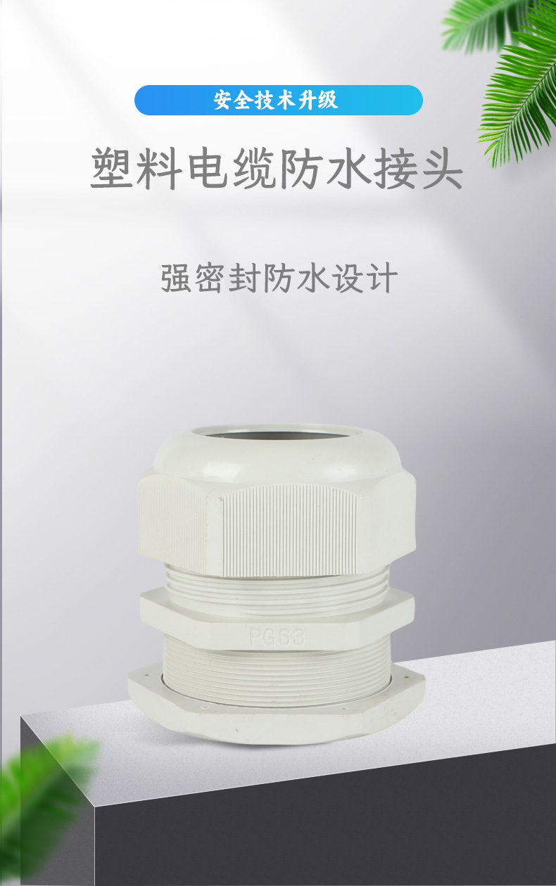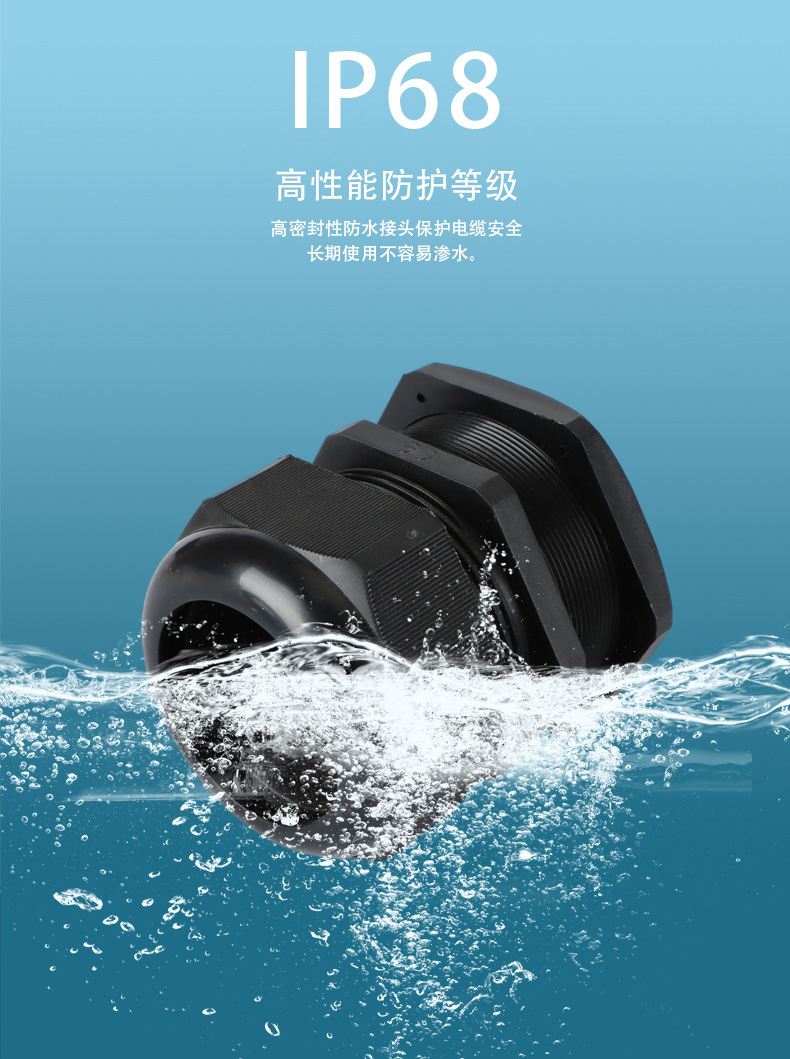 尼龍材質(zhì)適用惡劣環(huán)境紅、灰、黑、深灰、白、藍 六種顏色常規(guī):黑、灰兩種顏色,其它顏色需要定做在嚴(yán)寒與高溫等惡劣環(huán)境下,保持長期不開裂不漏水高密封性防水接頭保護電纜安全,長期使用不容易滲水