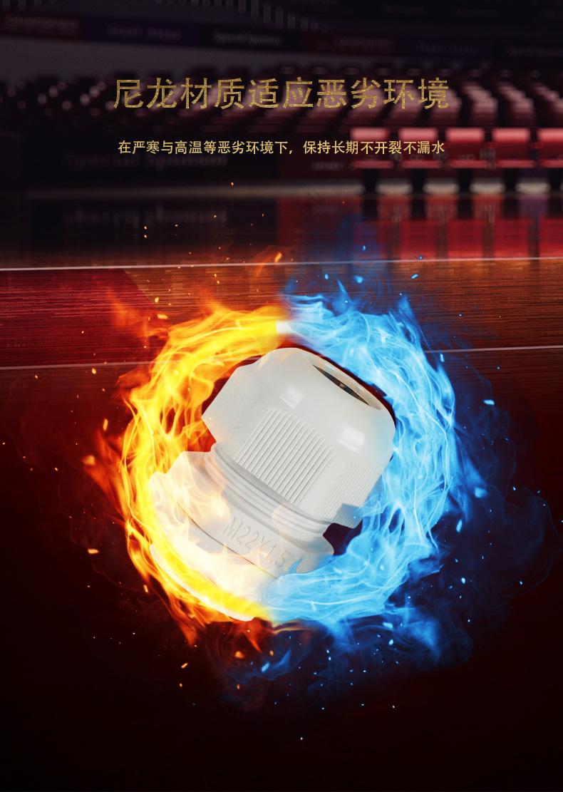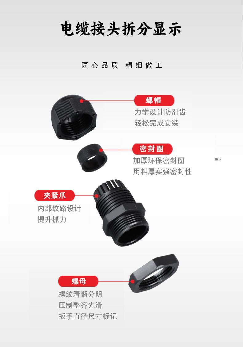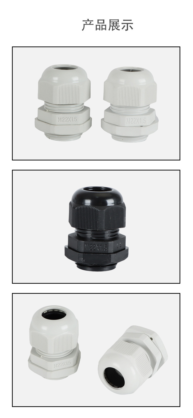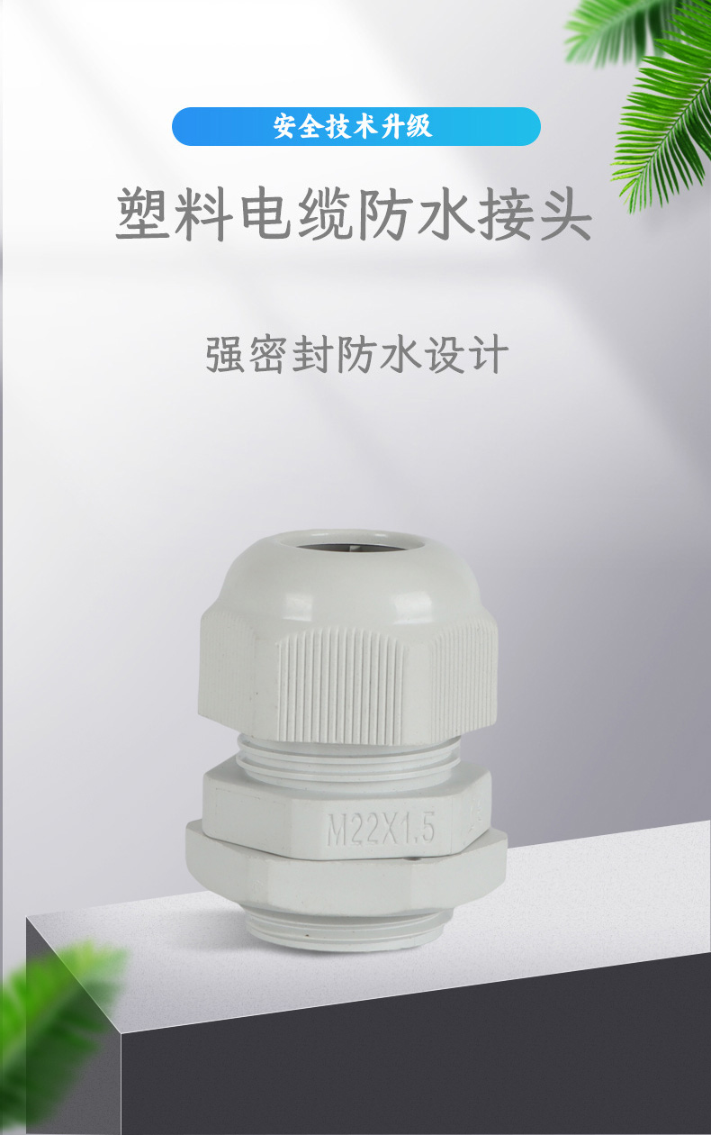 尼龍材質(zhì)適用惡劣環(huán)境紅、灰、黑、深灰、白、藍 六種顏色常規(guī):黑、灰兩種顏色,其它顏色需要定做在嚴寒與高溫等惡劣環(huán)境下,保持長期不開裂不漏水高密封性防水接頭保護電纜安全,長期使用不容易滲水
