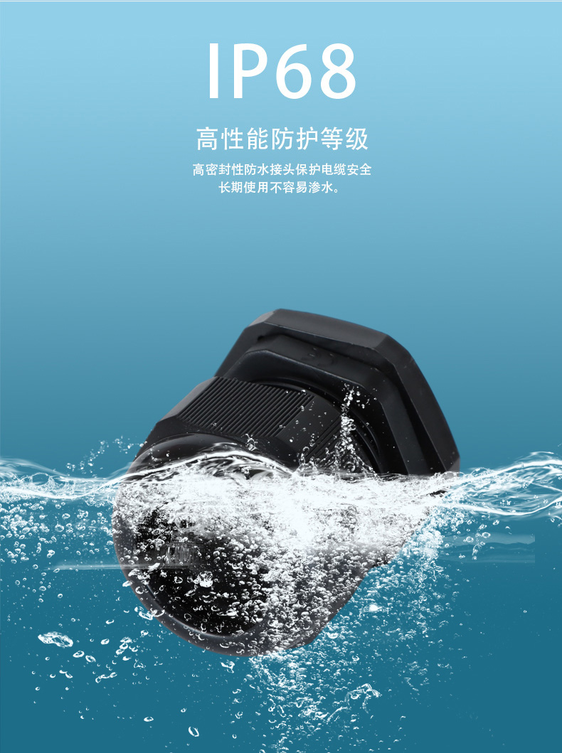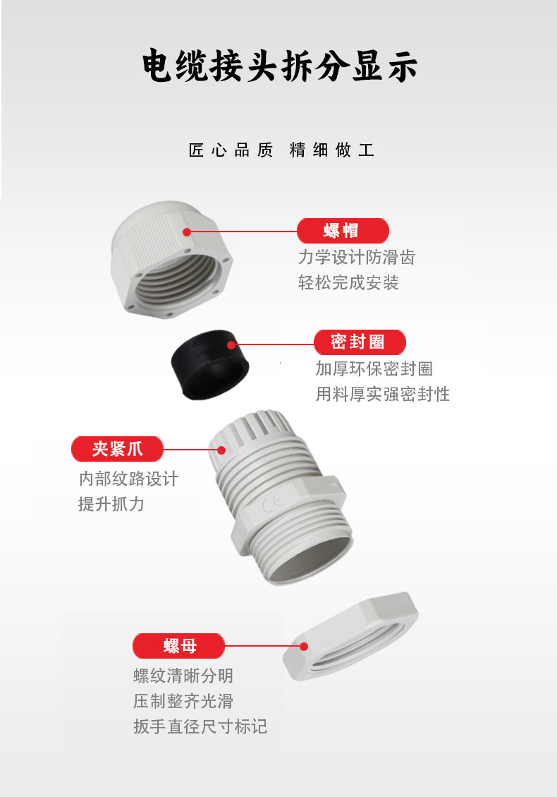 尼龍材質(zhì)適用惡劣環(huán)境紅、灰、黑、深灰、白、藍(lán) 六種顏色常規(guī):黑、灰兩種顏色,其它顏色需要定做在嚴(yán)寒與高溫等惡劣環(huán)境下,保持長(zhǎng)期不開裂不漏水高密封性防水接頭保護(hù)電纜安全,長(zhǎng)期使用不容易滲水
