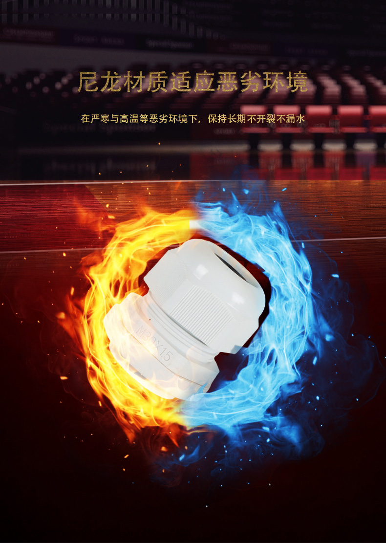 尼龍材質(zhì)適用惡劣環(huán)境紅、灰、黑、深灰、白、藍(lán) 六種顏色常規(guī):黑、灰兩種顏色,其它顏色需要定做在嚴(yán)寒與高溫等惡劣環(huán)境下,保持長(zhǎng)期不開(kāi)裂不漏水高密封性防水接頭保護(hù)電纜安全,長(zhǎng)期使用不容易滲水
