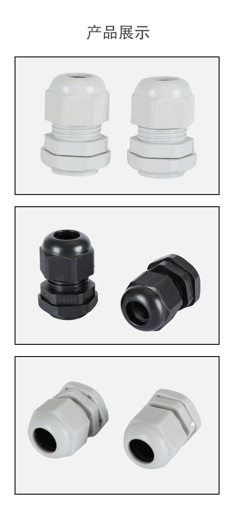 尼龍材質(zhì)適用惡劣環(huán)境紅、灰、黑、深灰、白、藍 六種顏色常規(guī):黑、灰兩種顏色,其它顏色需要定做在嚴寒與高溫等惡劣環(huán)境下,保持長期不開裂不漏水高密封性防水接頭保護電纜安全,長期使用不容易滲水