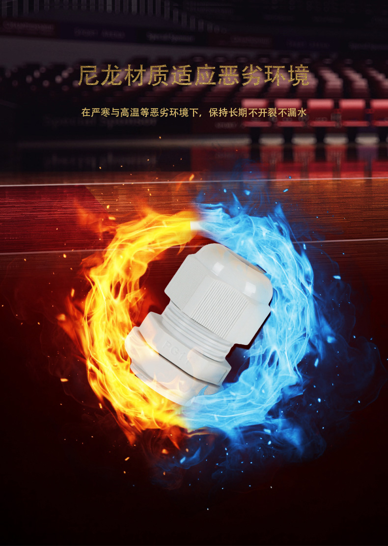 尼龍材質適用惡劣環(huán)境紅、灰、黑、深灰、白、藍 六種顏色常規(guī):黑、灰兩種顏色,其它顏色需要定做在嚴寒與高溫等惡劣環(huán)境下,保持長期不開裂不漏水高密封性防水接頭保護電纜安全,長期使用不容易滲水