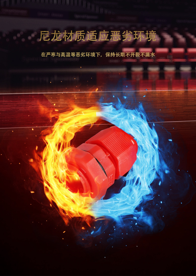 尼龍材質(zhì)適用惡劣環(huán)境紅、灰、黑、深灰、白、藍(lán) 六種顏色常規(guī):黑、灰兩種顏色,其它顏色需要定做在嚴(yán)寒與高溫等惡劣環(huán)境下,保持長期不開裂不漏水高密封性防水接頭保護(hù)電纜安全,長期使用不容易滲水